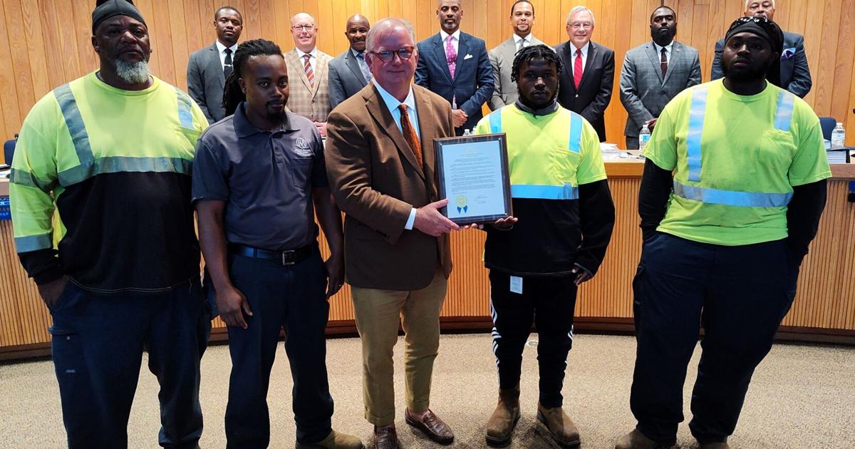 A city Streets and Stormwater Division ditch crew, with help from employees of Express Staffing, saved a life recently and were honored Monday with a resolution during the City Council’s