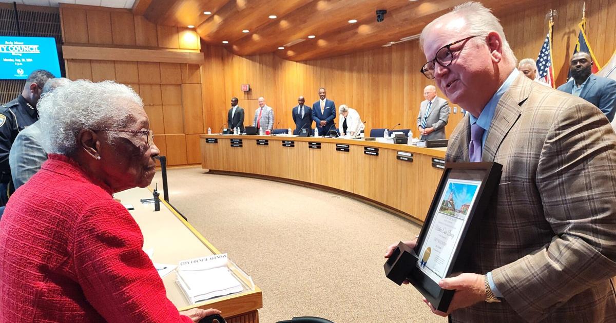 Essie Dancy received both a municipal plaque and a municipal coin from Mayor Sandy Roberson shortly after the start of the City Council’s regular meeting that afternoon.